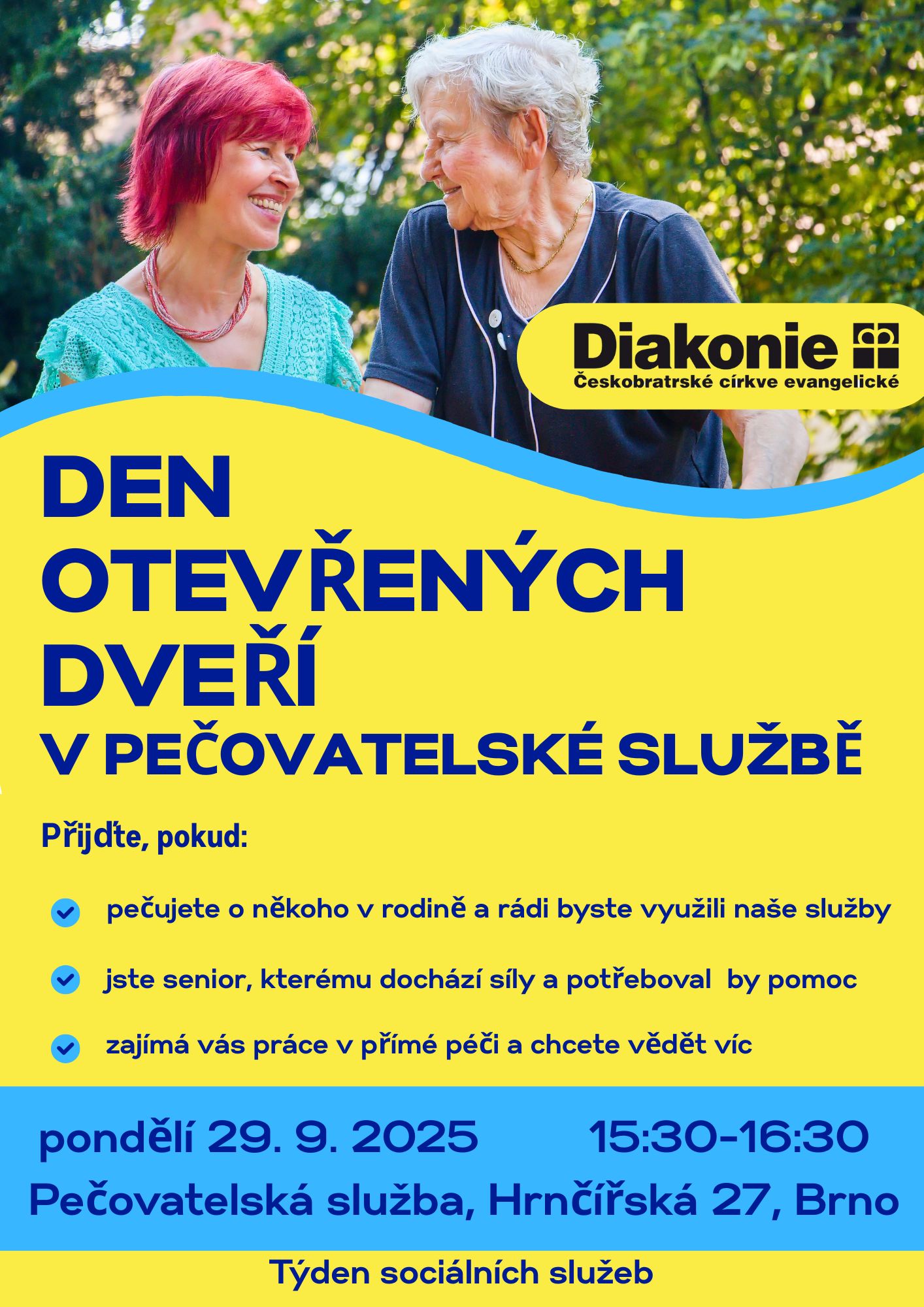 | Během Dnů otevřených dveří se seznámíte s našimi službami, nahlédnete do zázemí organizace a poradíme Vám, pokud pečujete o někoho v rodině. Dozvíte se také, jak podporujeme rodiny v péči o své blízké, a představíme možnosti spolupráce či dobrovolnictví. | 29.09.2025 | 10:00–17:00 |  |