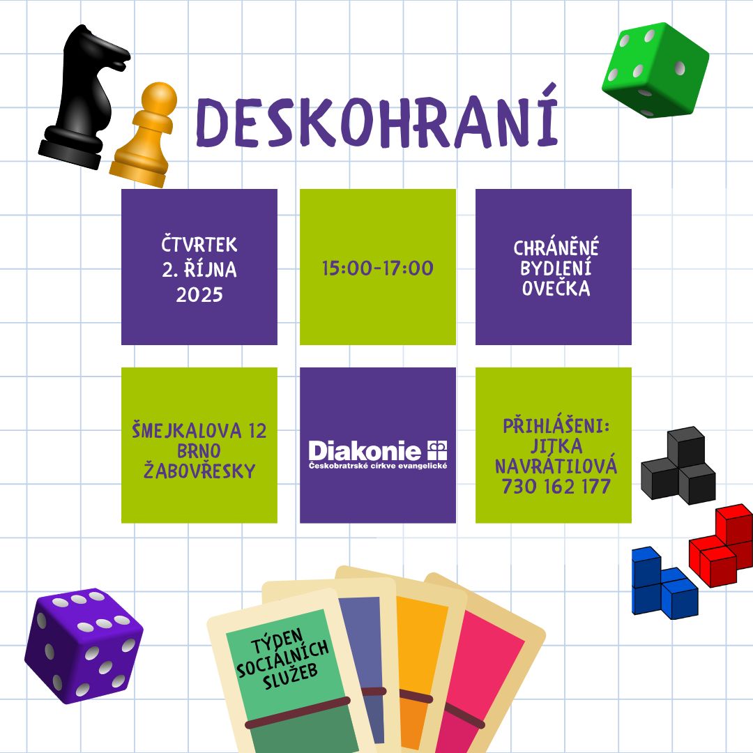 | Deskohraní s klienty Chráněného bydlení Ovečka | 02.10.2025 | 15:00-17:00 |  |