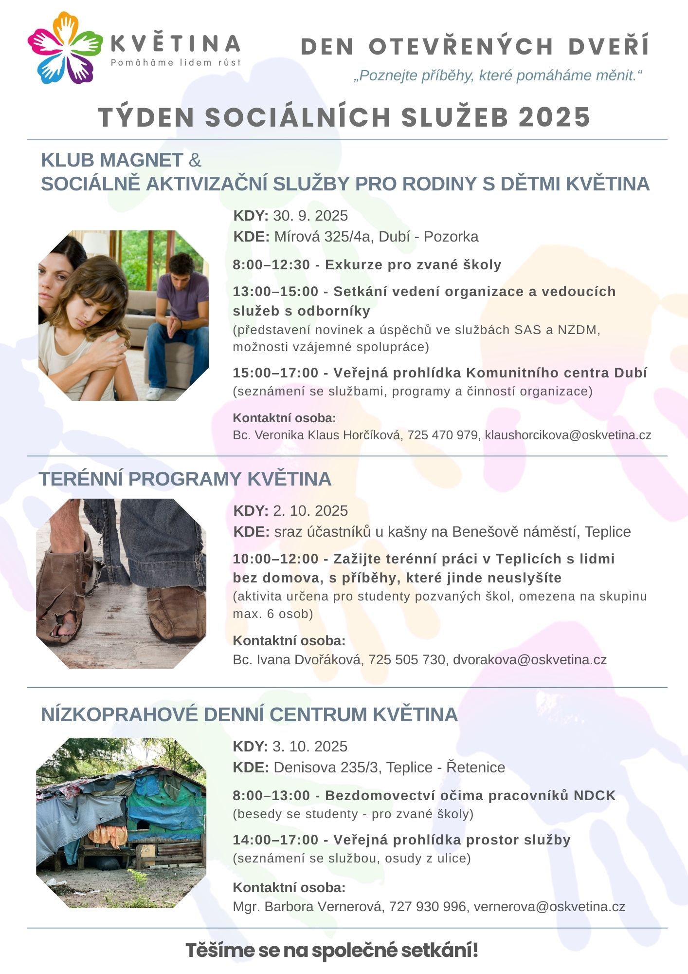 | Rozhovory s pracovníky, seznámení s poskytovanými službami (co poskytujeme a pro koho), prohlídka zařízení. | 01.10.2025 | 10:00 - 14:00 |  |
