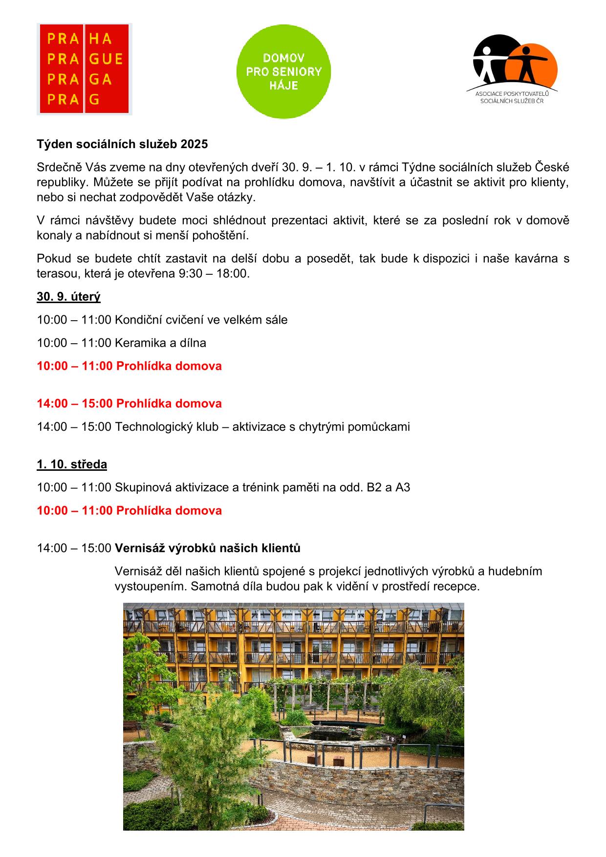 | Přijďte se seznámit s naším prostředím a dozvědět se vše, co Vás zajímá. Lze si odnést propagační materiály. Prohlédnout si můžete krásné práce našich obyvatel. | 29.09.2025 | 9:00 - 16:30 |  |